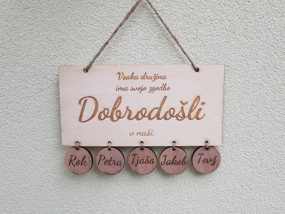 Tabla “Dobrodošli” je dimenzij 15 x 30 cm, z 45 cm premera krogci na katerih so vaša imena. Dimenzije table se lahko prilagodijo glede na število imen oz. krogcev.